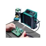 The Yihua 948Dq-III is a soldering station with a built-in smoke-absorbing function. It features a digital display that shows the temperature of the soldering iron, and has multiple functions to help with soldering tasks. The helping hand feature holds the workpiece steady while soldering, and the smoke-absorbing function helps to remove harmful fumes generated during the soldering process. The station also has a built-in fan to help dissipate the smoke.